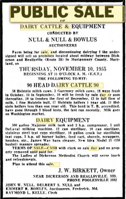 In 1946, the Birkett took out a mortgage which listed, among other things, 22 Holstein cows, 22 milk cans, a 12 can sterilizer, a bull, and several heifers. (See MDLandRec - Liber 1045/Folio 345)