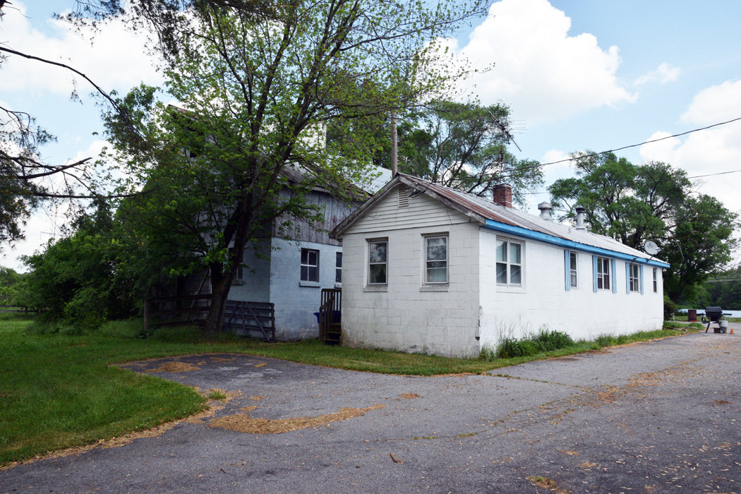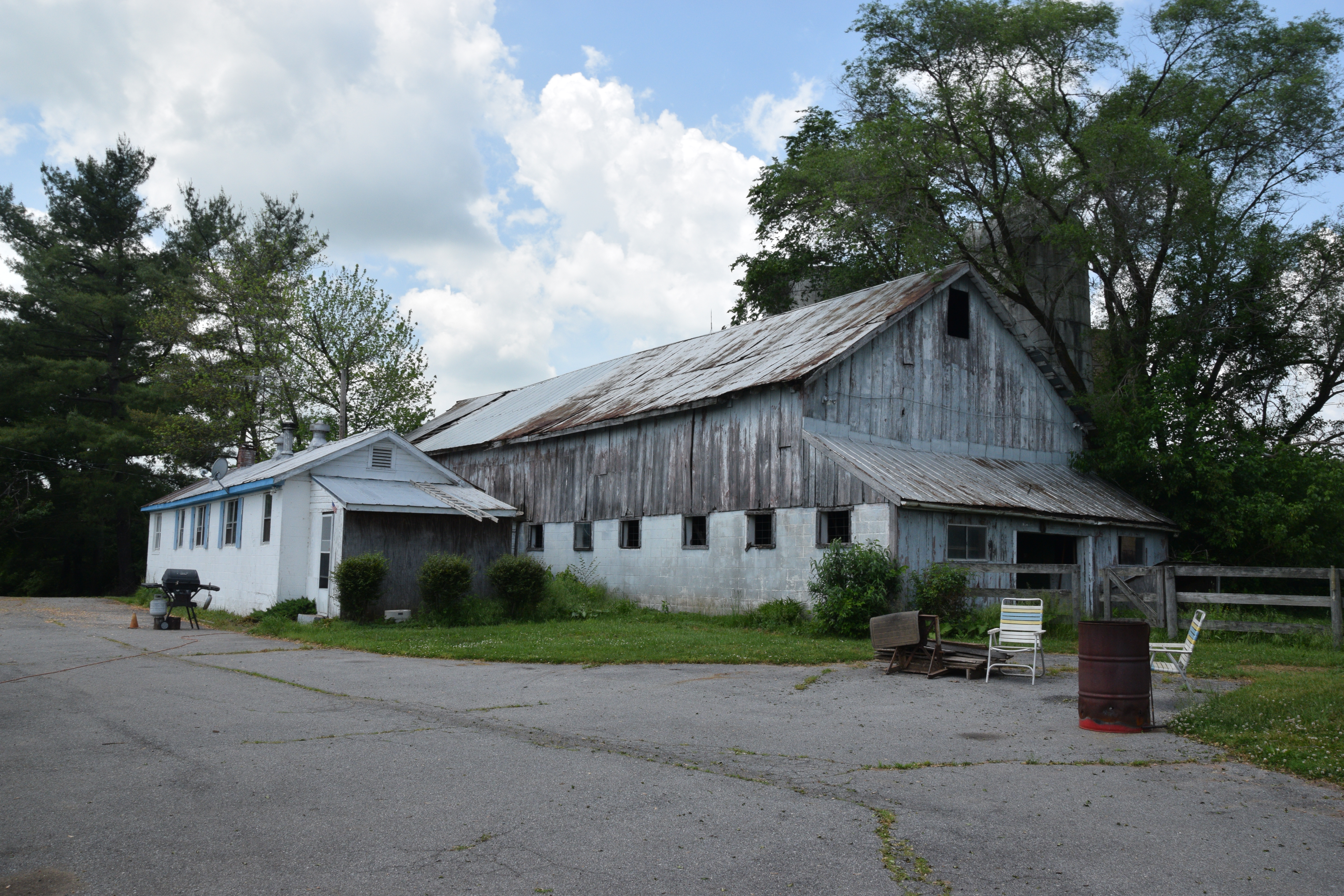 House and cinder block barn up front, stone barn foundation behind.