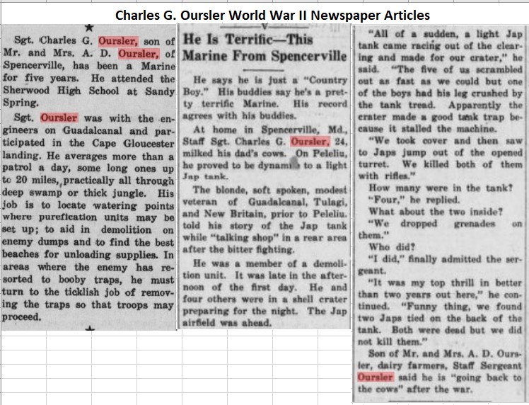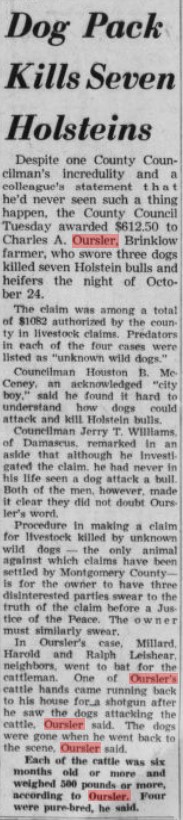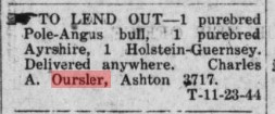 Other Written History Images: 1963 Oursler Holsteins killed by dogs 1942 Oursler Cattle ad 1944 Oursler Dairy Cows to lend 1944 Charles G. Oursler WWII News articles